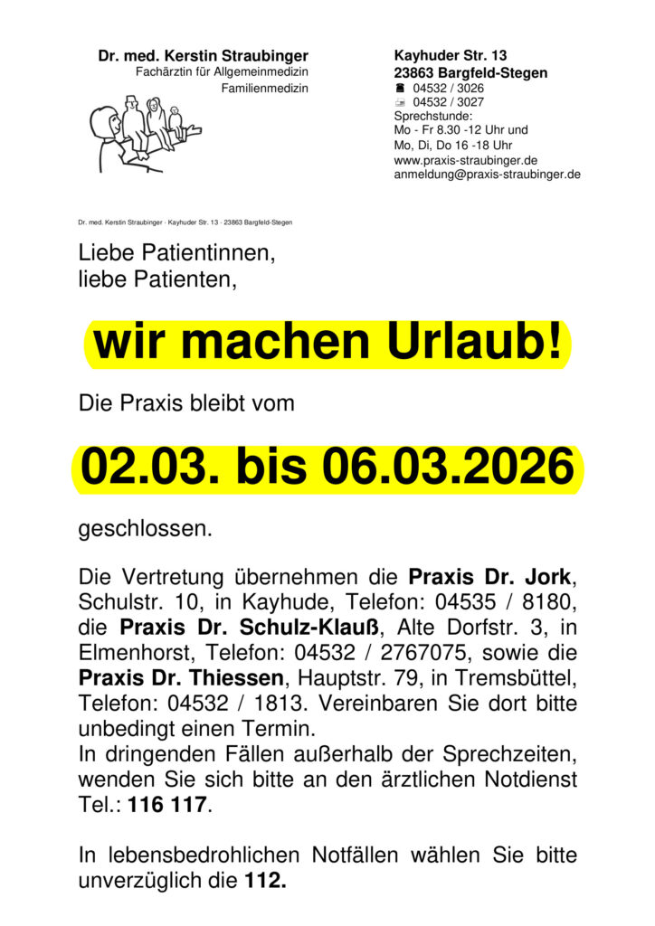 so können Sie sich im Voraus auf unsere Abwesenheit besser einstellen. Bitte denken Sie unbedingt rechtzeitig an einen ausreichenden Vorrat Ihrer regelmäßig einzunehmenden Medikamente.